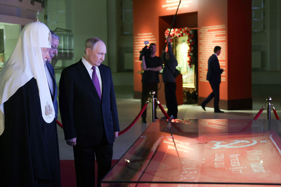 Знамя Победы, водруженное над рейхстагом и впервые за последние 20 лет вывезенное из хранилища Центрального музея Вооруженных сил Российской Федерации, и другие святыни стали ключевыми экспонатами выставки.