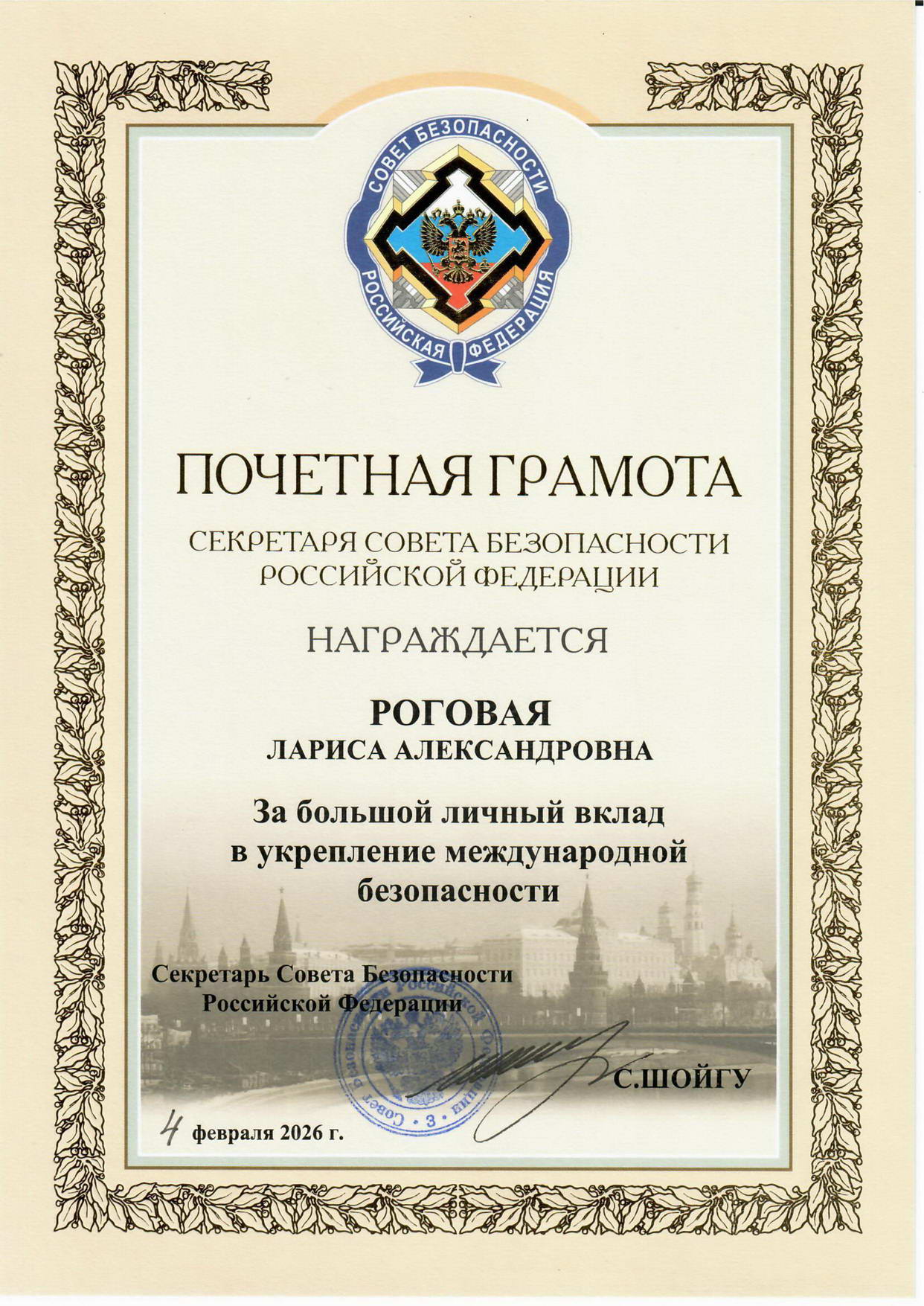 6 февраля 2026 г. Директор Государственного архива Российской Федерации Лариса Роговая награждена Почетной грамотой Секретаря Совета Безопасности РФ С.К. Шойгу за большой личный вклад в укрепление международной безопасности.