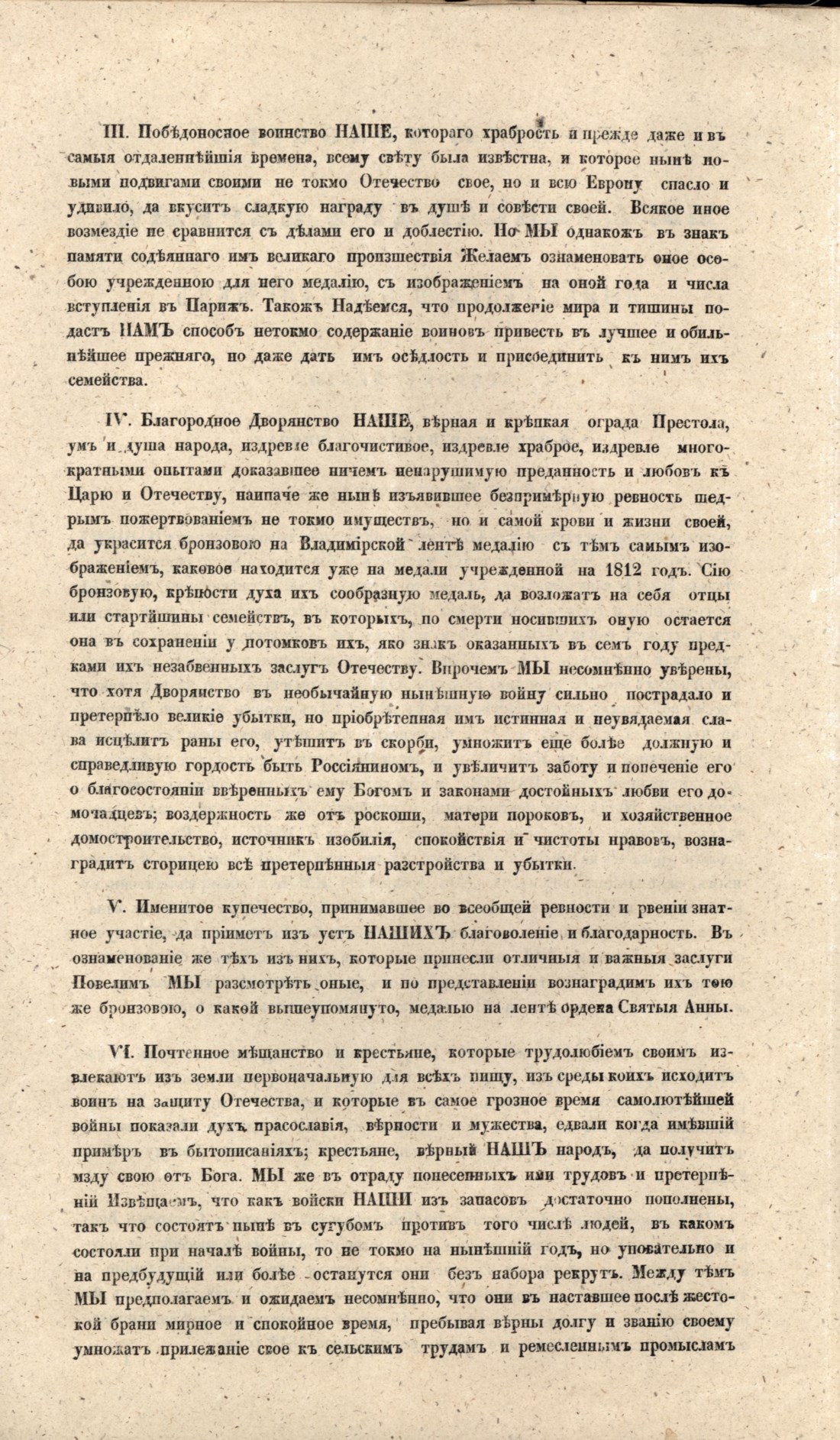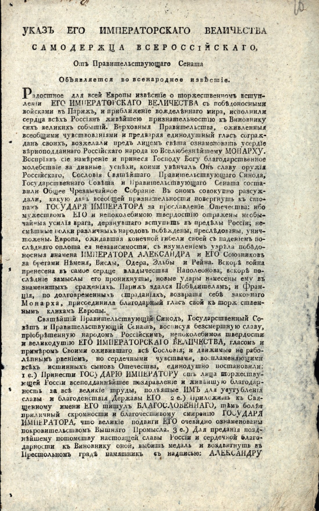При императоре Александре I Российская империя участвовала в ряде военных конфликтов: Отечественная война 1812 г., Русско-персидская война (1804-1813), Русско-турецкая война (1806-1812), Русско-шведская (1808-1809). За время правления Александра I Российская империя победила во всех четырех войнах. 30 августа 1814 г. манифестом Александра I была учреждена бронзовая медаль «В память Отечественной войны 1812 г.» (впервые в истории медалистики выполнена была из темной бронзы). Вскоре после окончания Отечественной войны 1812 г. император Александр I принял решение о возведении храма Христа Спасителя.